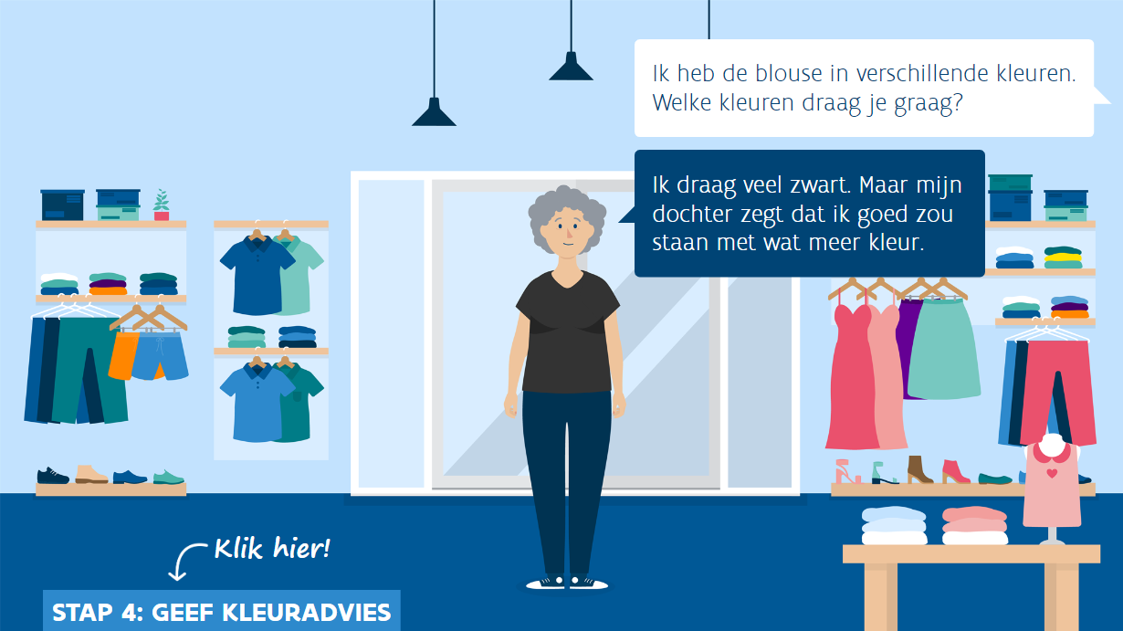 Storytelling maakt een groot verschil. In de cursus Kledingadvies speelt alles zich af in een fictieve, maar realistische kledingwinkel. Cursisten helpen 9 uiteenlopende klanten, elk met hun eigen stijl, lichaamsbouw, achtergrond en vragen.