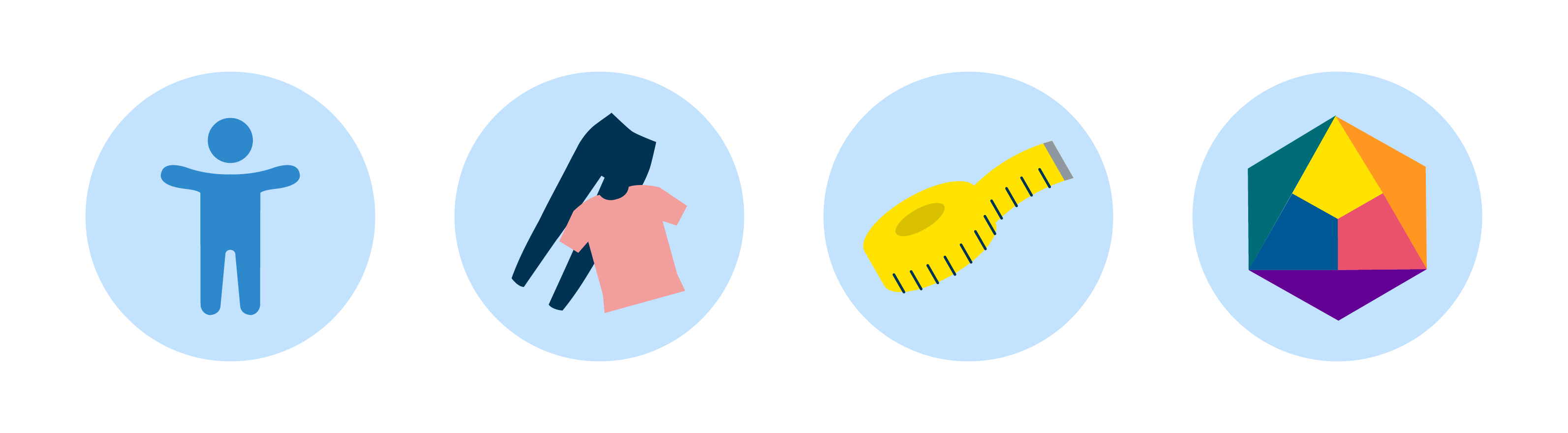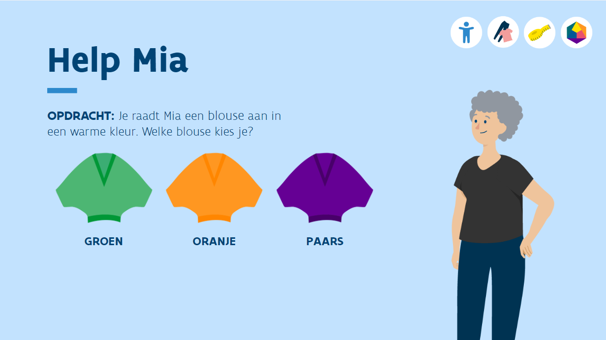 In onze e-learning Kledingadvies kan de cursist op elk moment - via 4 iconen - de volledige theorie bekijken per thema (figuurtypes, kledingstukken, maten en kleuren). Zo behoudt de cursist autonomie: je beslist zelf wanneer je extra info nodig hebt.
